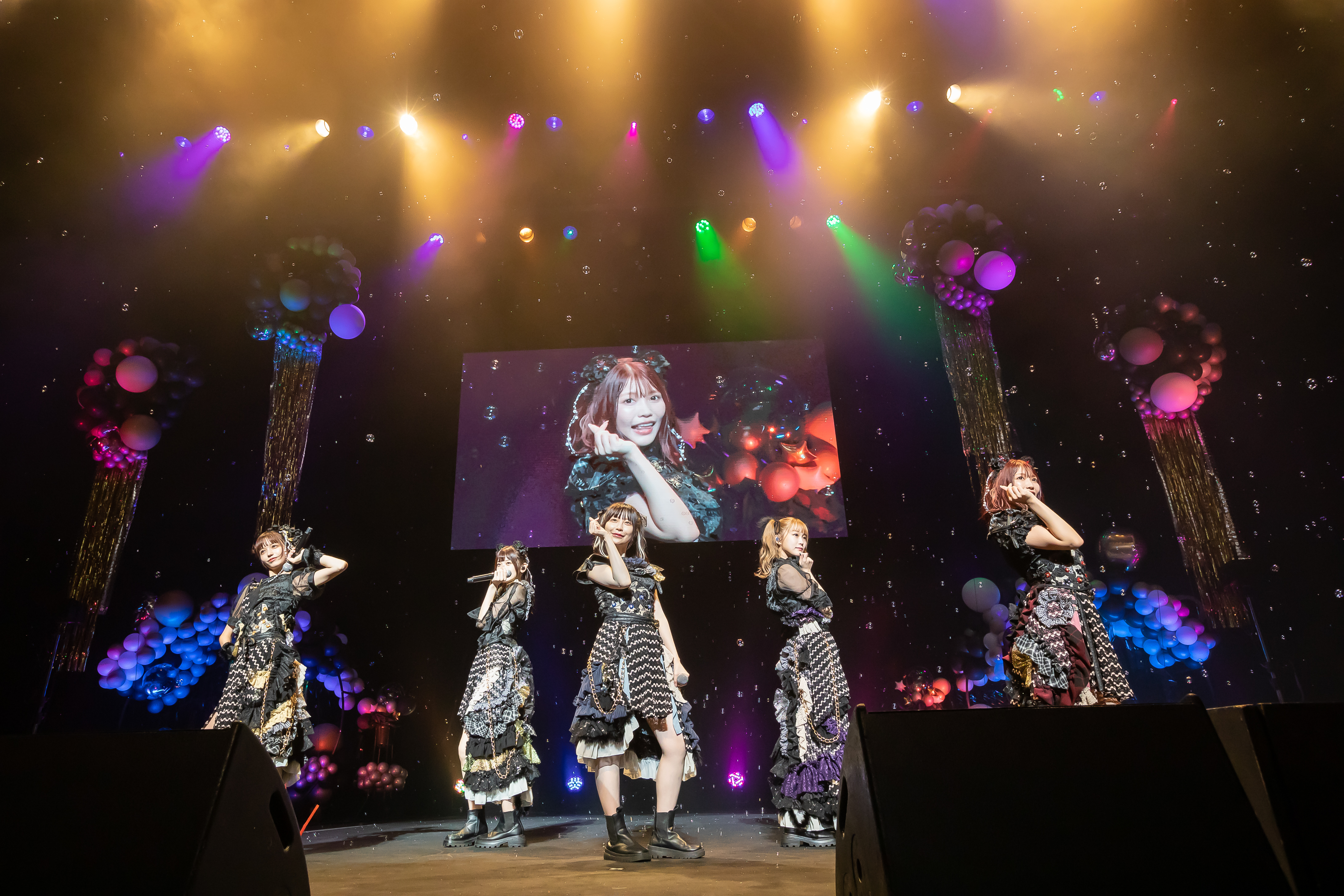 会場が暗転すると、どん帳が上がり、ステージにはゴールドやシルバーのバルーンで作られたオブジェとともに、巨大なバルーンがお目見えした。オープニングVTRが終わると同時にバルーンが割れ、新衣装を身に纏った5人がキュートなポーズで登場。センターを務める松下が「まねきケチャ7周年、盛り上がっていくぞー!」と発し、初期から歌い続けている鉄板曲「冗談じゃないね」でライブは賑やかに幕を開けた。カラフルなレーザー光線がフロアを行き交い、盛大なスモークが焚かれる派手な演出の中でメンバーが<うりゃおい>という掛け声で煽ると、観客はサイリウムを掲げてジャンプで応戦し、「SPLASH」でもメンバーが回るタオルに合わせてサイリウムを振り回し、冒頭からフロアの熱気は最高潮に達した。