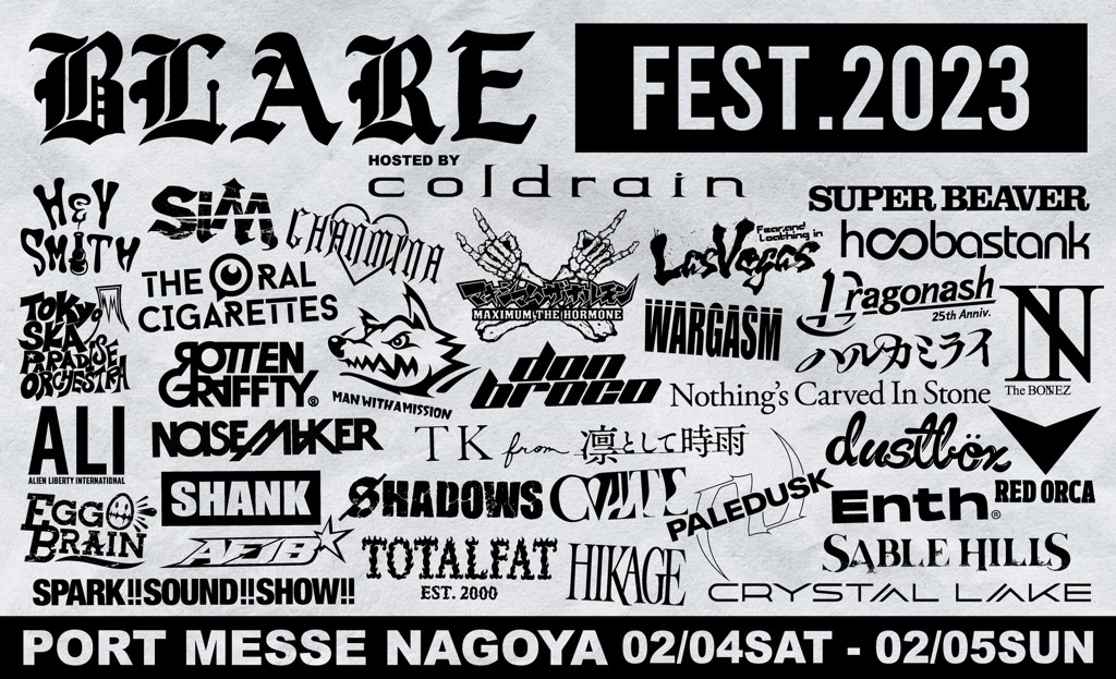 coldrainが2010年に立ち上げたライヴイベント『BLARE DOWN BARRIES』(ブレア・ダウン・バリアーズ=爆音で壁を壊す)をバンド初の主催大型フェスとして地元・名古屋「ポートメッセなごや」にて1日2万人×2デイズに亘って開催した「BLARE FEST.2020」。FEVER333やThe Word Alive、We Came As Romansといった海外勢、国内からはONE OK ROCKや国内のラウドロックバンドに多大な影響を与えたラウドロックのレジェンドPay money To my Painといったcoldrainだからこそ招聘できたラインナップが話題となり、チケットは即完。初回にして伝説と化した同フェス「BLARE FEST.2023」が2023年2月4日(土)、5日(日)に3年ぶりに開催。全出演者が一挙発表となった。