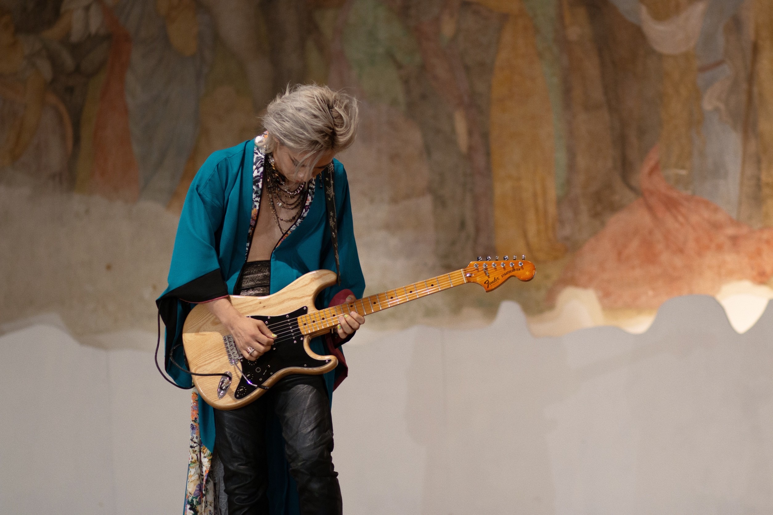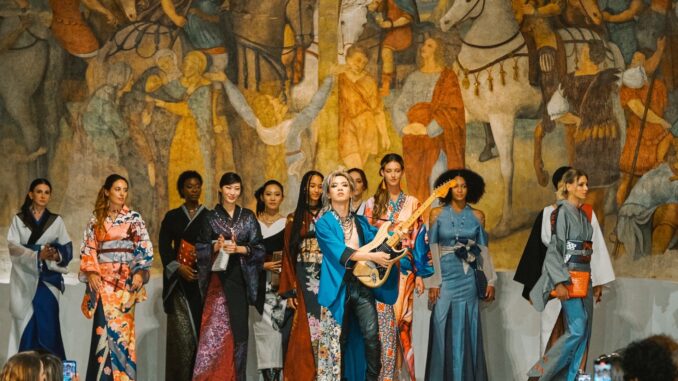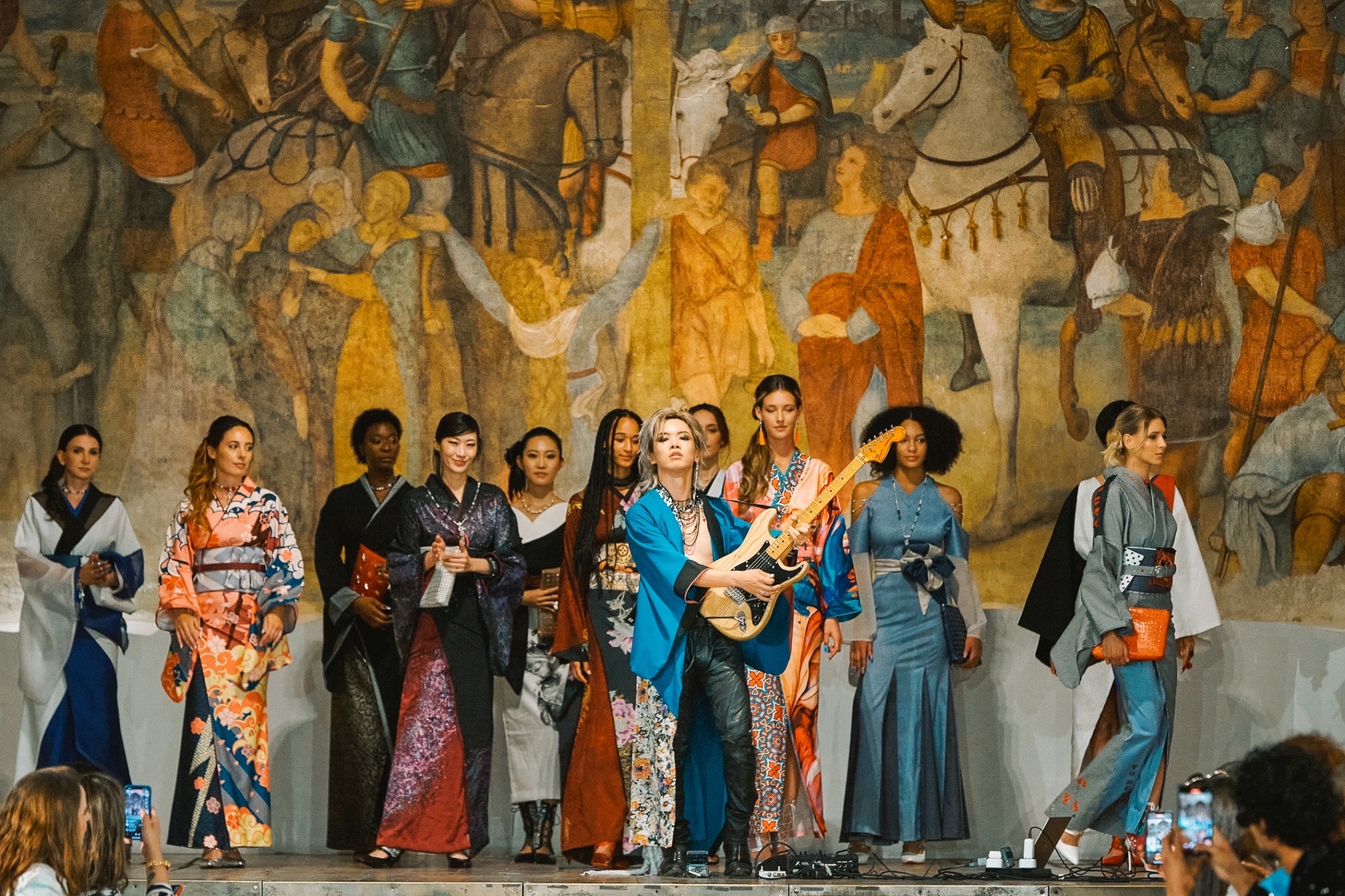 ハイブリッド着物ブランド『SOURA』のファッションショーで、HIROTOはギターの生演奏を披露。