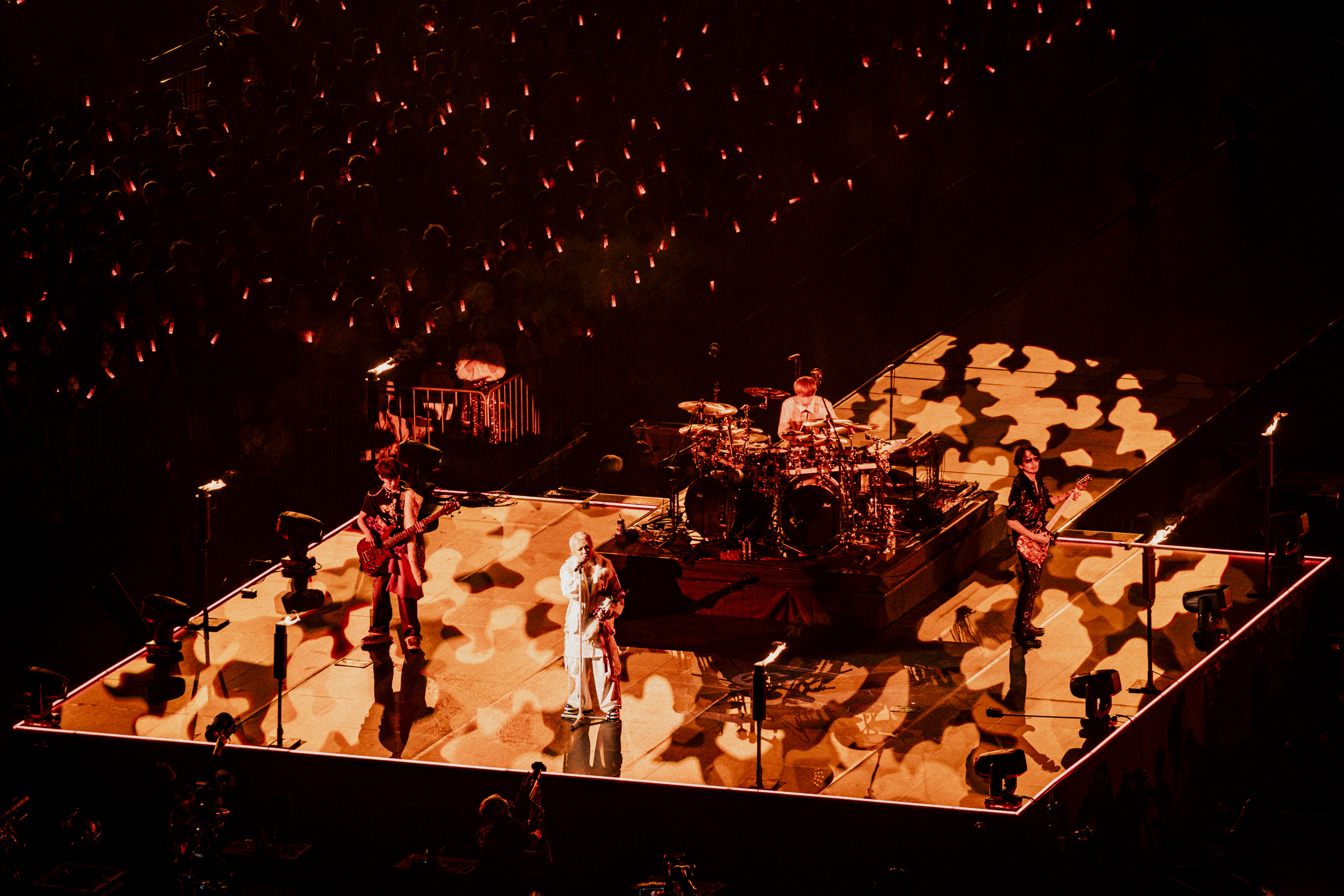 汽車の連結された4つの車輪が大写しになり、煙を出しながら動きはじめると、kenが「fate」のイントロを奏ではじめた。4人の音が絡みあうバンドを象徴した映像でもあったのだろうか? 全体を通して、誕生祭というテーマからか、巡る命を円や丸のモチーフでくり返し表現していたように感じた。泉の水がこんこんと湧きでるようななめらかで透明なkenのギターに聴きほれ、4人の音の美しい重なりに息をのむほかなかった。「花葬」では、暗い光のなかで赤く浮かびあがるメンバーの顔が、まさに歌詞の<闇に浮かぶ花>。yukihiroのドラムもtetsuyaのベースも、土台を築くというよりも情感豊かに“歌って”おり、4人の合唱を聴いているかのようだった。
