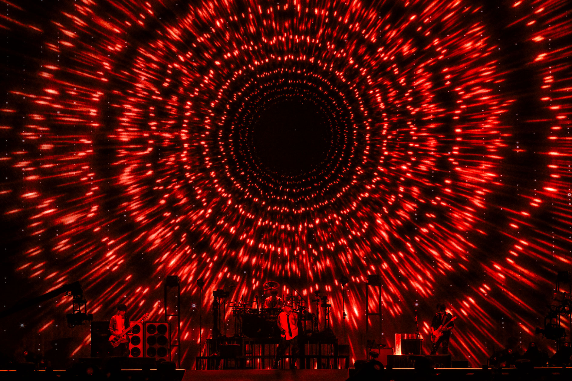 緑色のレーザーがさまようなか、アレンジされたイントロがループし、やがてメンバーの鳴らす音が加わっていく。客席でファンが持つ L’ライトは無線制御で瞬き、緑から赤へと照明が切りかわり、ついに4人が登場、大歓声が響く。