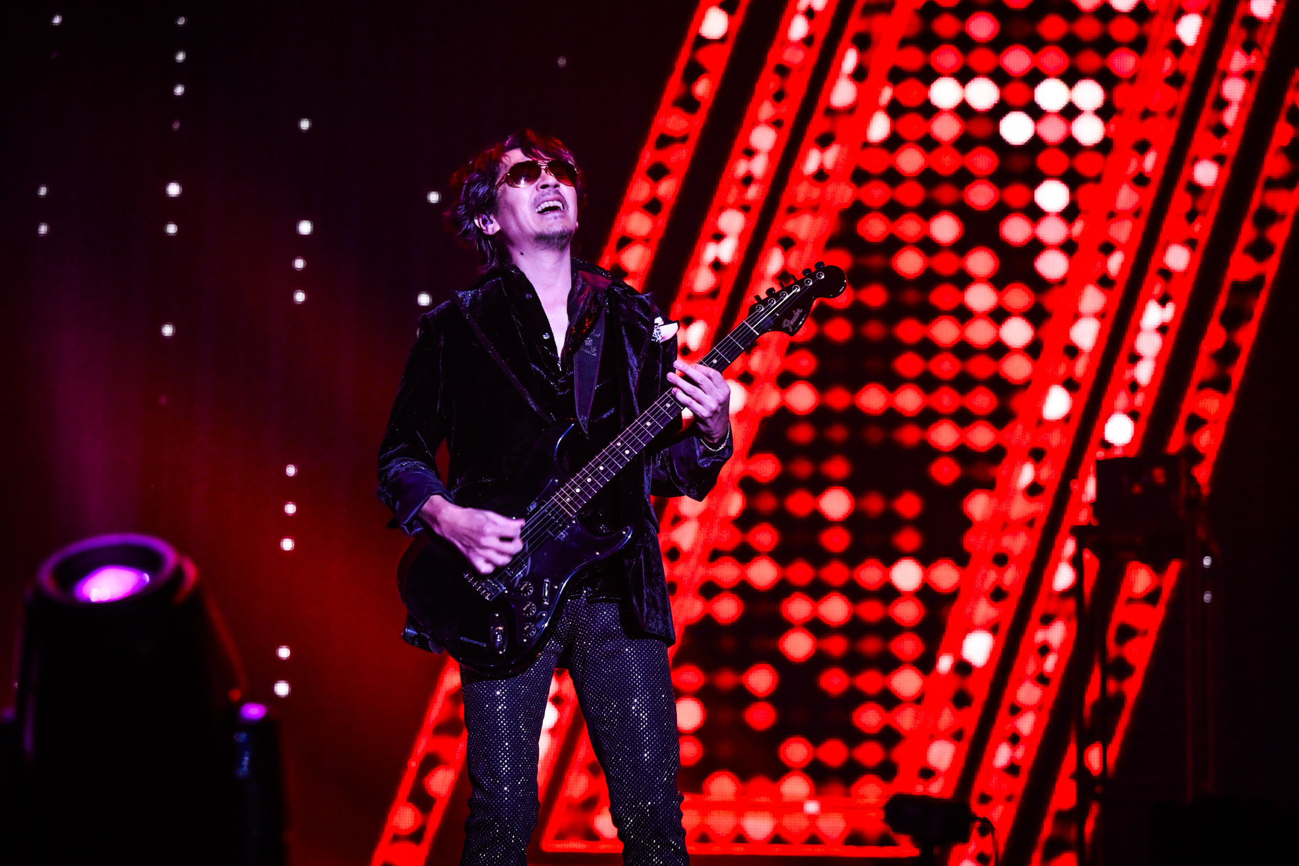 すぐに「接吻」のギターリフが鳴りはじめ、粘りけのあるグルーヴを生みながら4人は重厚なロックサウンドをくり出していく。ギターソロを弾きながらkenは花道を歩いてセンターステージへ。<接吻を交わそう>のフレーズをくり返し弾き、ファンと溶けあおうとする。シンセ音がやがて重なりはじめて、kenがみだれ弾く自由でダイナミックなギターソロタイムへ。