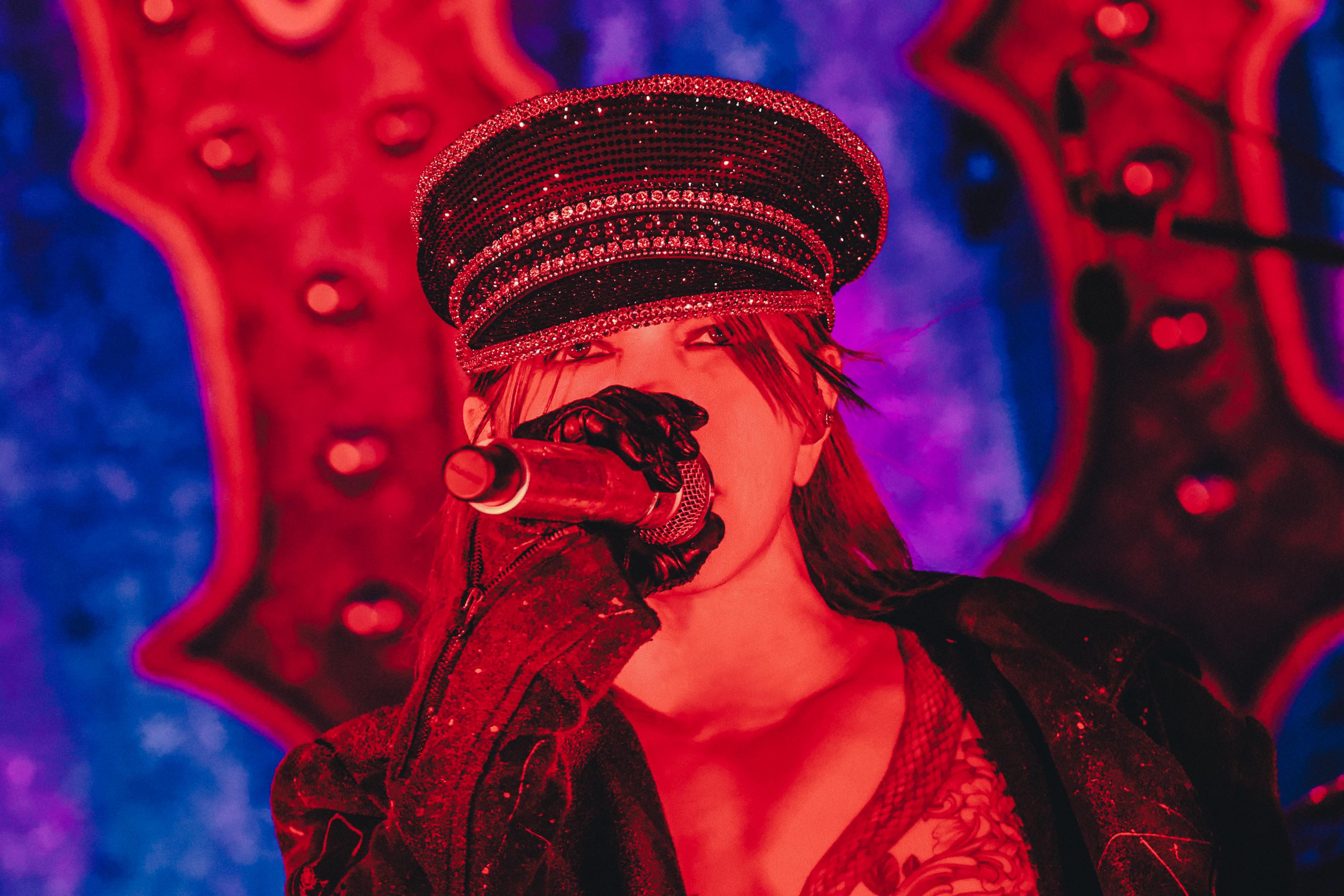 HYDEにそう問われて「ノー」と答えるファンなどこの場にいるはずもなく、ステージが間髪入れずに畳み掛けてくる「DEFEAT」に全力で跳ね躍るフロア。HYDEの闘志にも本格的に火がついたのだろう、顔面を覆っていたハーフマスクを自ら剥ぎ取り、その美貌をあらわにしてはひときわ猛る。ステージ端に積み上げられたスピーカーアンプによじ登ったかと思えば、フロア最前列に身を乗り出して四方八方から伸びる手にもみくちゃにされながらグロウルからハイトーンまで自在に轟かせたり、軍帽をかぶってフラッグを高々と掲げる勇姿でオーディエンスを鼓舞したり、一瞬たりと目を離す隙を与えない。