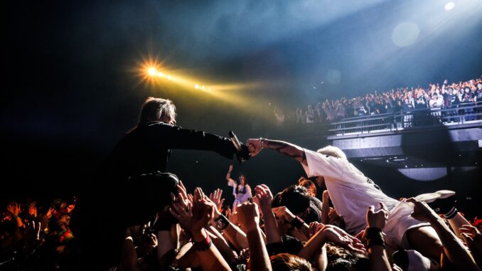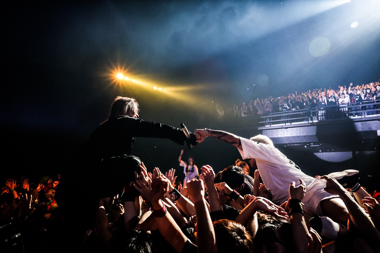 それにしてもなんと伸び伸びとしたフロアの盛り上がりだろう。リフトアップもクラウドサーフも、どちらのエリアでもひっきりなしだが、その違いは明確にわかる。HYDEが言っていた通り、エリア分けされたことで男性も女性もお互いにより遠慮なくそれぞれの本領を発揮、それが相乗し合って想像以上のパワーを生んだのかもしれない。男女の垣根のないカオティックな盛り上がりも捨てがたい魅力である一方、こうした試みによって拓かれる可能性もきっとある。ここにきてHYDEのライヴはまた一つ、新たな武器を手に入れたと言えそうだ。