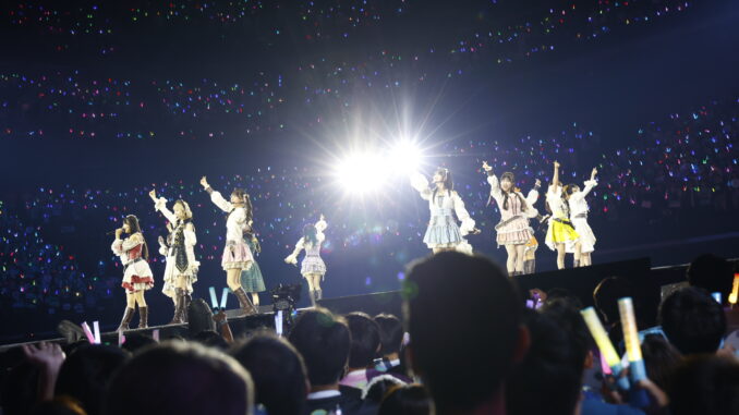 ところが、ここからは追加公演ならではのサプライズが。ステージに姿を見せたのは蟹沢萌子・櫻井もも・冨田菜々風の3人。本ツアーでは未披露だった蟹沢・櫻井・冨田3人ユニット曲『薄明光線』で妖艶に、次いで『ワタシアクセント』で会場をダンスフロアに、『#おふしょるにっと』ではあまあまの可愛さを、『月下美人』では川中子奈月心と先日フジテレビ「千鳥の鬼レンチャン」での人気企画「サビだけカラオケ」で鬼レンチャンを達成した櫻井ももによる美しいハモリを響かせるなど、意外性あふれるセットリストに会場の熱気はコンサート中盤にもかかわらず早くもピークに達した。表現力が試される振り幅の広い楽曲たちをしっかりと歌い上げ、改めて彼女たちの確かな成長と実力を再確認するパフォーマンスであった。