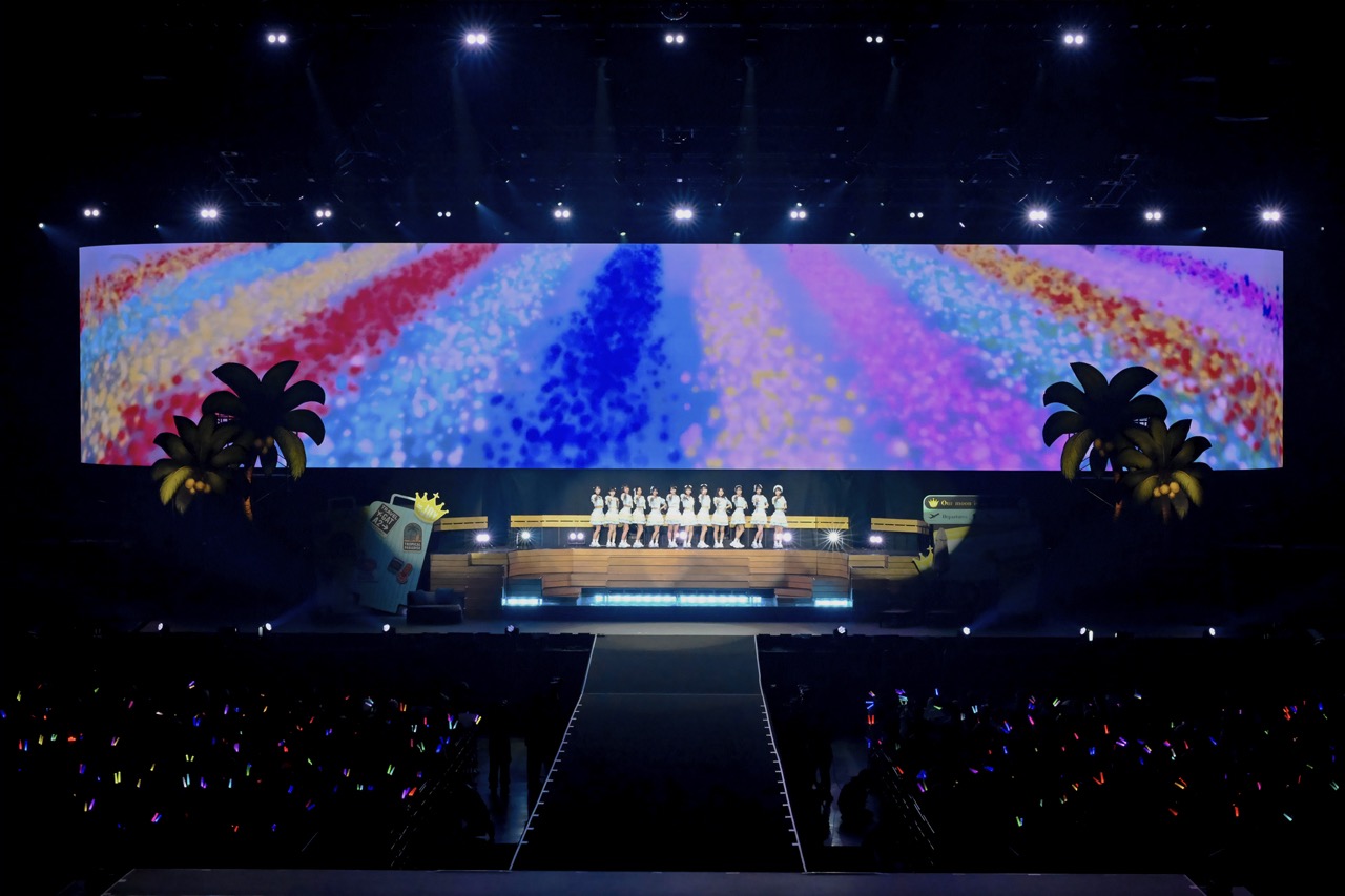 その後も先輩グループのカバーを盛り込みつつ、華やかな“空の旅”を経て南の島へ着いた≒JOY。彼女たちは『ブルーハワイレモン』などのサマーチューンを連発して会場をさわやかな空気で満たし、ラストスパートでは『体育館ディスコ』『初恋シンデレラ』などの鉄板曲を畳みかけた。