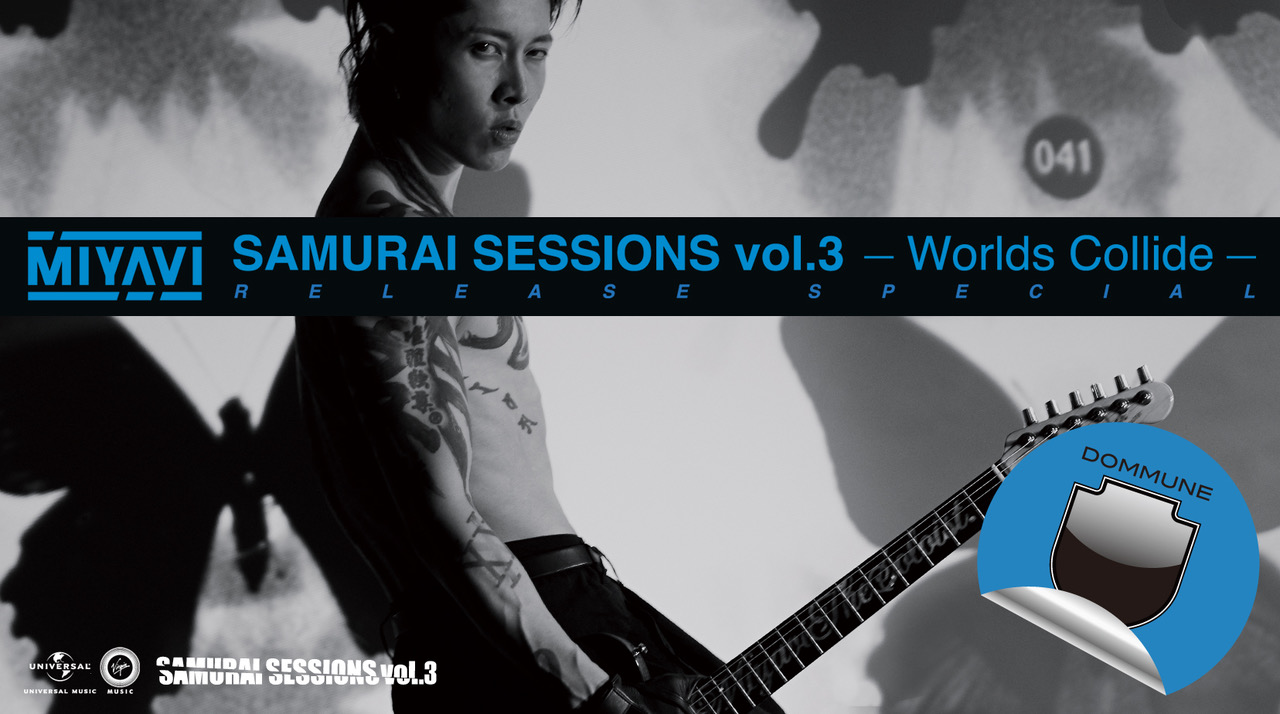 MIYAVI『SAMURAI SESSIONS vol.3 – Worlds Collide -』が12月5日本日発売(https://umj.lnk.to/miyavi_ss3PR)。発売を記念して、本日19時よりライブストリーミングサイトDOMMUNE(ドミューン、http://www.dommune.com/)の生配信が決定!!ここ2年MIYAVIのジャケットデザインを担当してきた縁のある宇川直宏のストリーミングメディアにMIYAVIが生出演し、ライブパフォーマンスすることが決定。また番組内では『SAMURAI SESSIONS vol.3 – Worlds Collide -』についてたっぷりと語りつつ、今年の様々な活動について振り返り、今後のプロジェクトについて語る予定となっている。