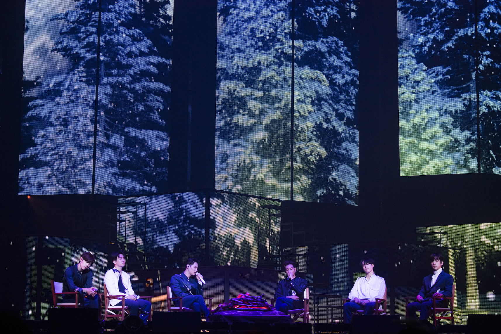 四季をテーマとした本公演の最後のパート“冬”のステージでは、キャンプチェアに座ってリラックスした空気の中、心温まるバラードナンバーを熱唱し、エネルギッシュなだけではない彼らの幅広い魅力を思う存分発揮した。