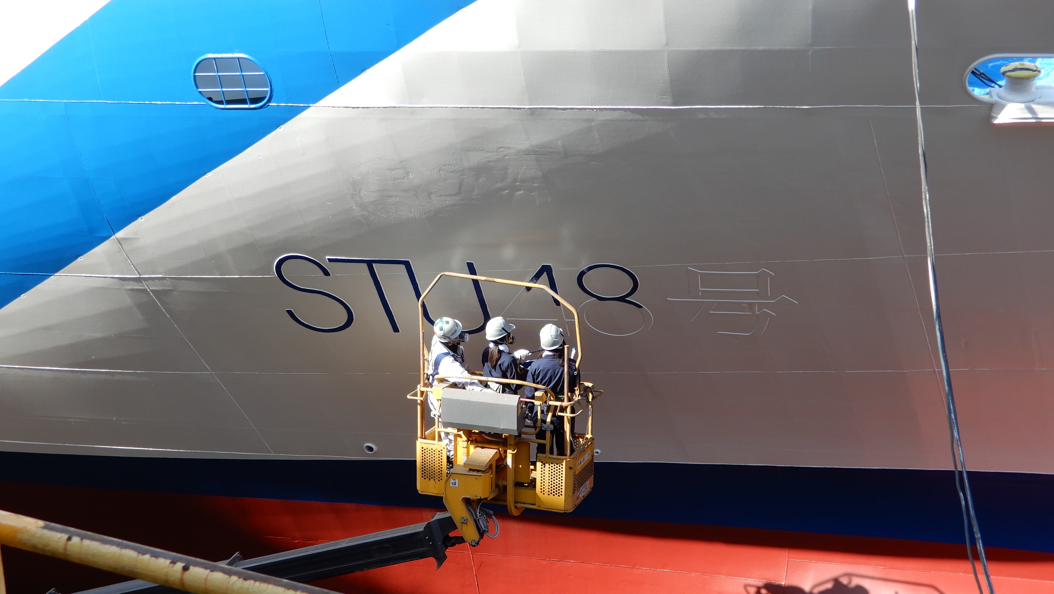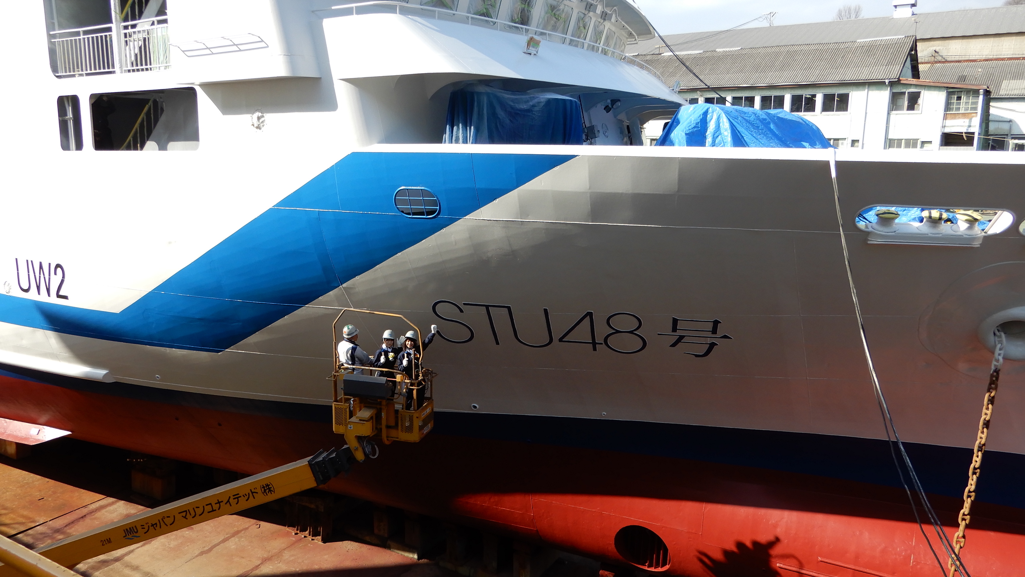 イベント同⽇のお昼頃に今春に完成予定の「STU48号」の船名プレートのペイント作業をメンバーの 藤原あずさと⽮野帆夏が⾏った様⼦を、映像で報告。