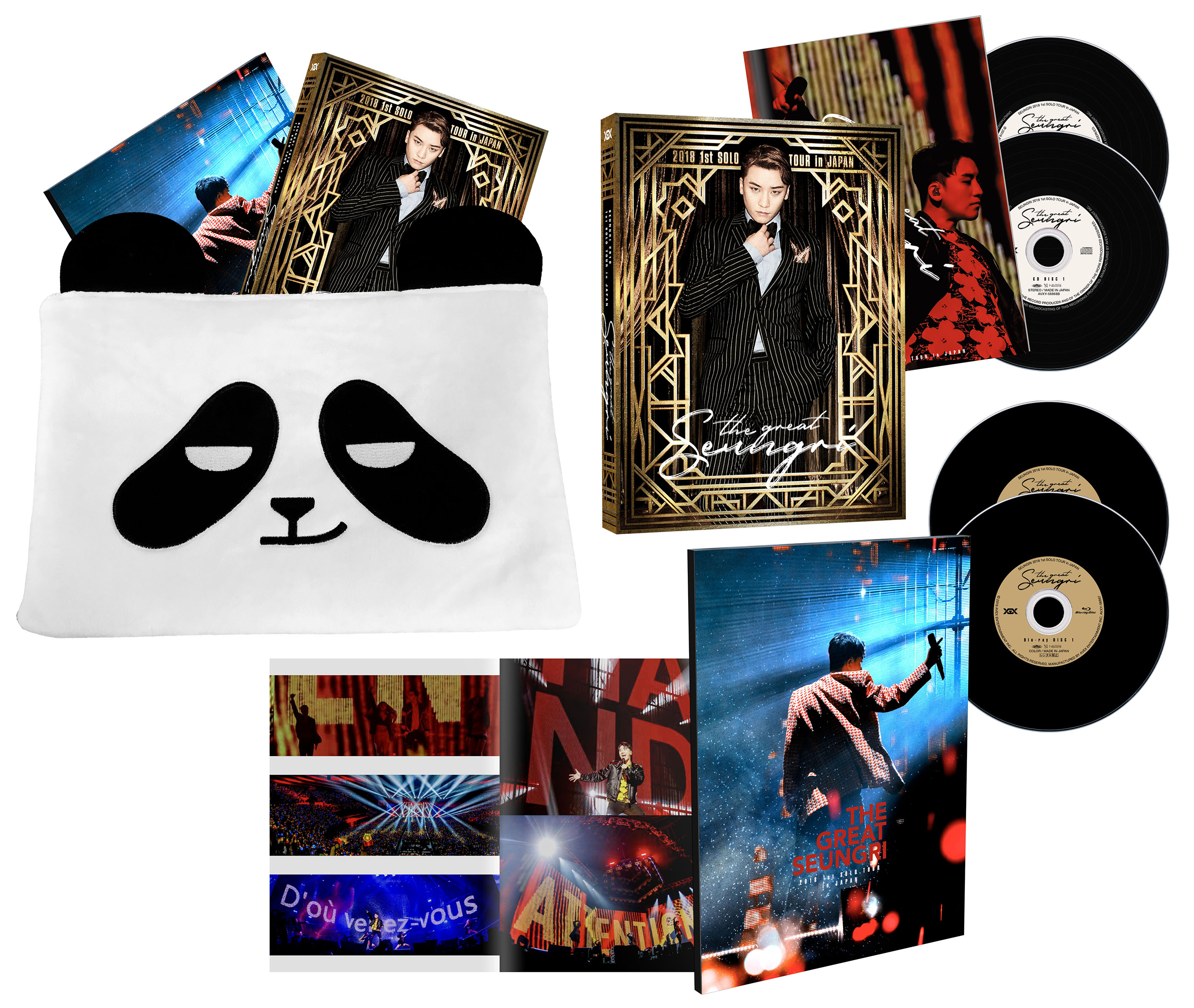 STRONG PANDAクラッチバッグ仕様の初回生産限定DELUXE EDITIONには、完全日本オリジナルとなる特典コンテンツも多数コンパイル。各公演のMCを編集した[SPECIAL FEATURES]や、各会場のライブ映像で特別編集をした[COLLECTION OF BEST MOMENTS] 5曲と、様々なカメラアングルが楽しめる[SPECIAL CAM] 3曲を完全収録。さらにはソロとして初出演したヤンマースタジアム長居での[a-nation 2018]ライブ映像全12曲とアルバム『THE GREAT SEUNGRI』のリリースを記念して行われた[“WHERE R U FROM” THE GREAT FLASH MOB feat. PIKOTARO]といった特典映像も収録し、トータル6時間を超える大ボリュームの映像コンテンツに加え、25曲入り2枚組みLIVE CDまでをもパッケージングした超豪華内容となっている。