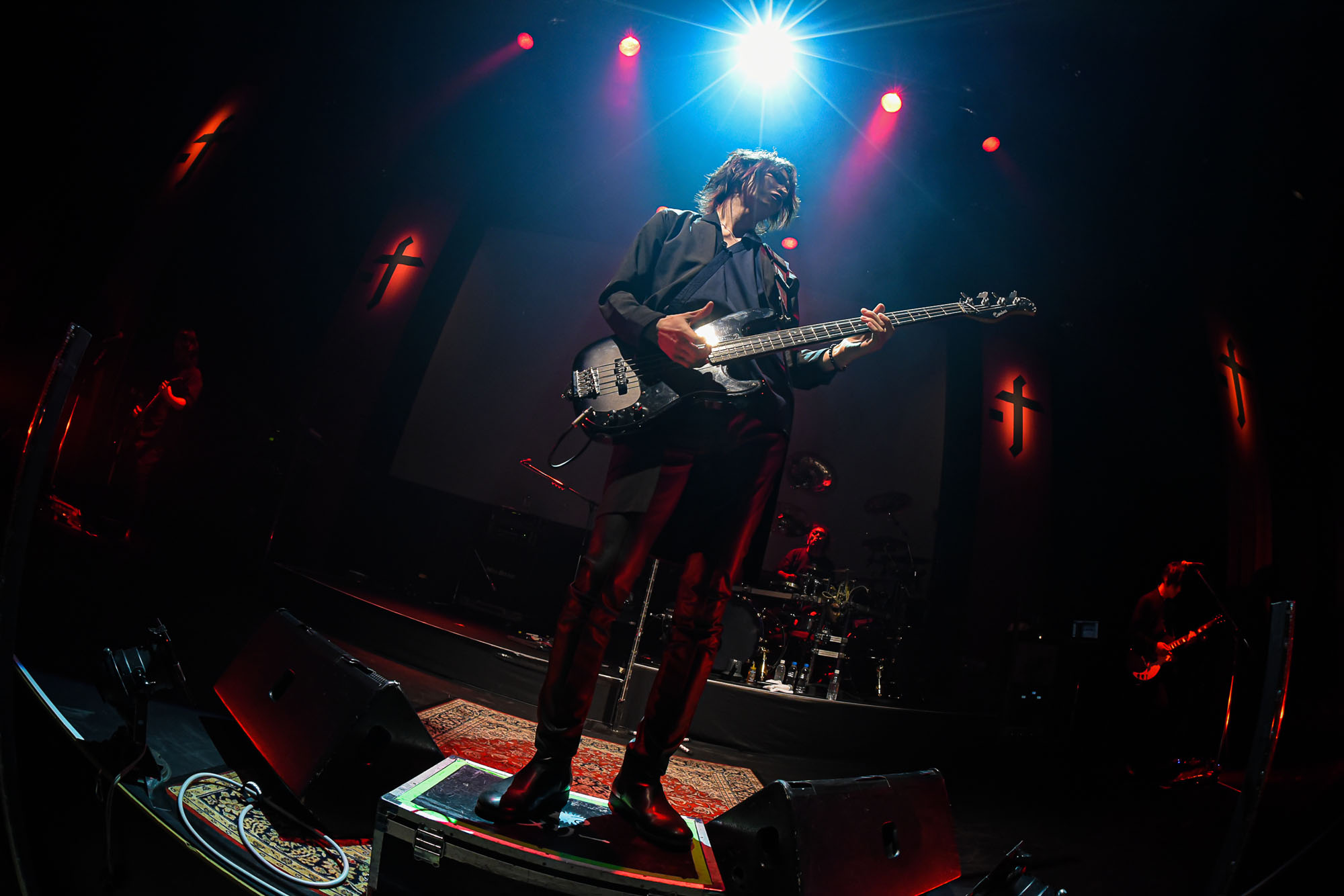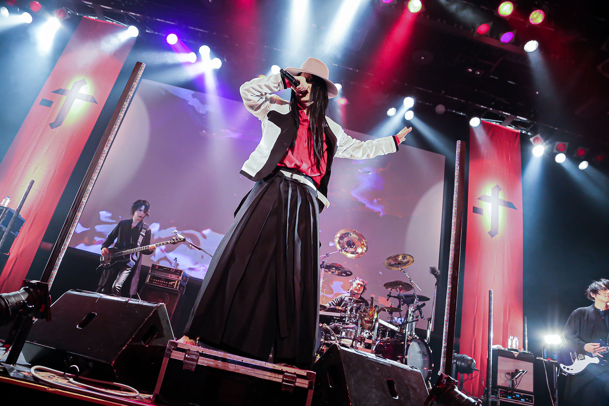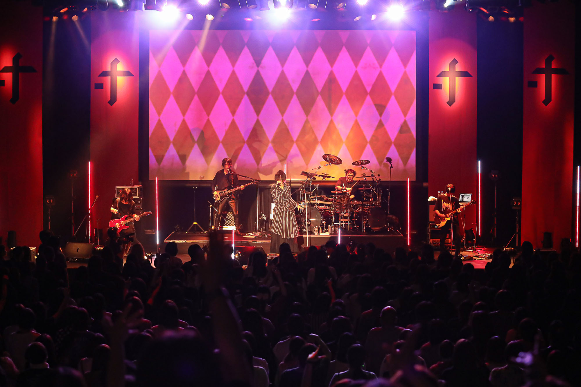 ツアーファイナルのこの日は、久々のホールの舞台に立つガラ(Vo)、結生(G)、健一(G)、テツ(B)、ネロ(Dr)の姿がまぶしい。『for Japanese sheeple』の核となる「Toxicosis Island」で幕を開けると、序盤から「finale」「Carnival」といった熱狂曲で観客の心に火をつけた。