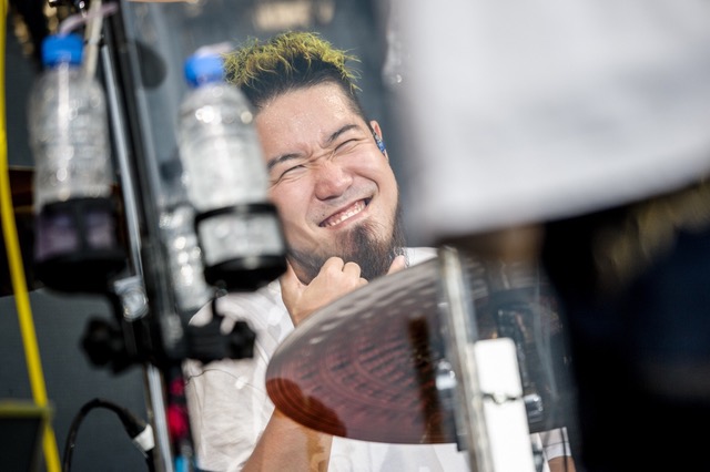 恥ずかしいとか、照れくさいとか、ちょっとスカしてみがちとか、そういういろんな人のいろんな性格を、空から降ってくる水が文字通り洗い流していく。客席から上がる歌声も、MCに対するリアクションも、曲を追うごとに大きくなっていくようだ。大合唱が巻き起こった“昨日の歌”に“サブマリン”、もはやファンには恒例となったモノマネの「ご本人」に会ったときのエピソードを開陳したFUJIに向けられた盛大な拍手。7月17日リリースのニューシングル『Summer Trap!!』からの新曲“夏のどこかへ”ですら(三ツ矢サイダー2019 CMソングとしてCMで流れて、先行配信されていたとはいえ)、まるで長年親しんだ曲のように歌われ、愛されている。KENTAは水をかぶったお客さんに「寒くない?」と訊くが、客席からはむしろ「暑い!!」という声が返ってくるほどだ。この日の天気は夏らしい晴天というわけにはいかなかったが、だからこそ、WANIMAの音楽に込められた「熱さ」がより一層ヴィヴィッドに感じられるような気すらする。