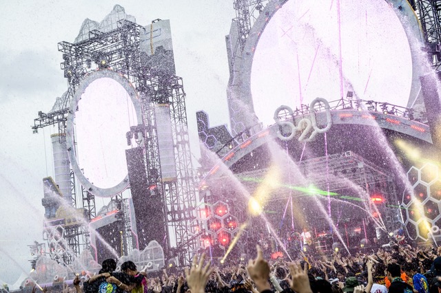 “いいから”で水に加えて炎まで上がるフルスケールの演出で堂々のフィナーレを飾ったあと、アンコールでも惜しみなく名曲たちを披露した3人。お客さんのリクエストに応えた“エル”の《明日は晴れるかな》という歌詞はこの曇り空の下で感情を分かち合う今日の僕たちにぴったりだったし、“ともに”の大合唱の中、水しぶきにレーザー光線が当たってキラキラ光る様子はこの日だけの特別な美しさだった。そしてラスト、“花火”の演奏とともに空に打ち上げられた大輪の花――夏の始まりを告げるというよりも、これから楽しいことも苦しいことも待っているに違いない夏に向かっていくみんなの背中を押すように、色とりどりの花は咲き誇っていたように見えた。最後の最後、「風邪引かないでください!!」という言葉が添えられたKO-SHINによる手締めで大団円。汗も涙も一緒くたになった全身ずぶ濡れのスペシャルライブは温かく幕をおろした。