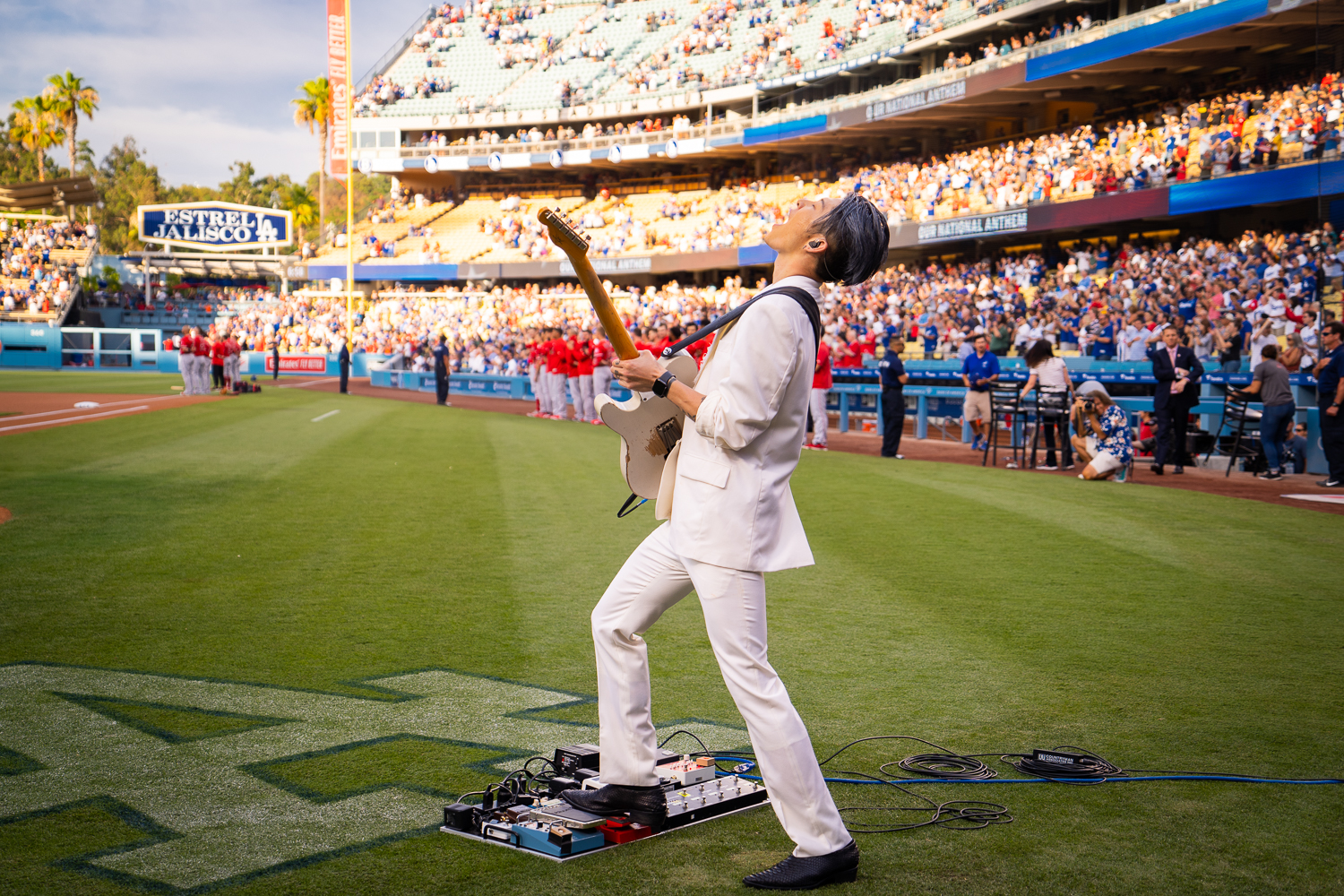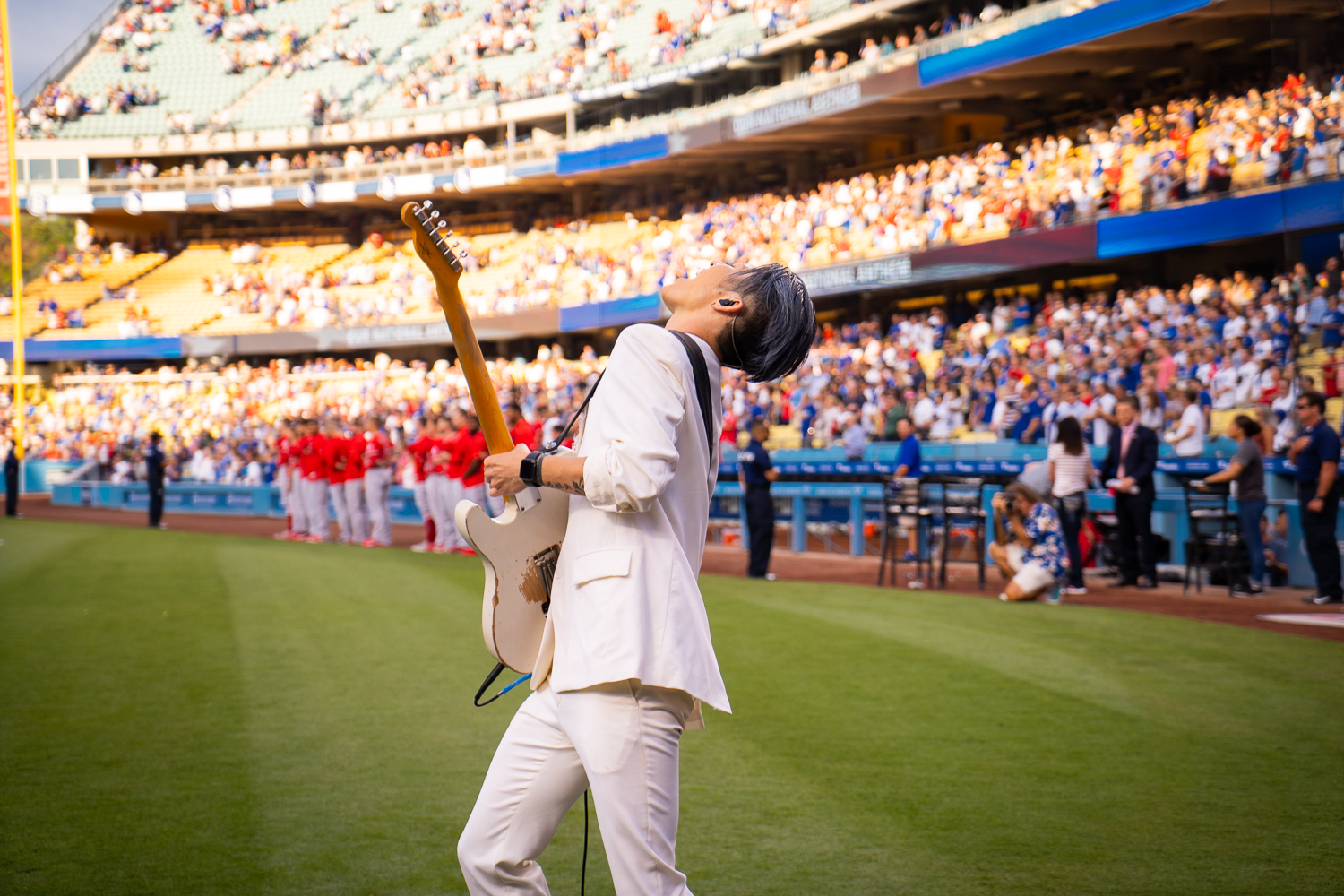 そんな勢いに乗るMIYAVIが24日午後7時10分(日本時間25日午前11時10分)開始の米大リーグドジャースが開催する「ジャパン・ナイト」にて、イベント開催を祝し、試合前のフィールド上にて、セレモニーのためにアメリカ国歌を演奏し、「WHAT’S MY NAME?」と「No Sleep Till Tokyo」のパフォーマンスを披露した。この日はエンゼルス戦となり、始球式では女子テニスの大坂なおみが務めている。