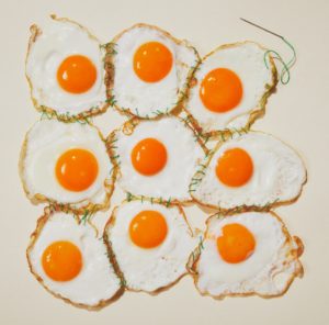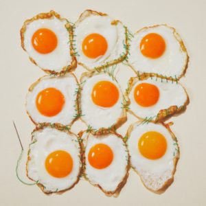 緑色の糸で縫われた、インパクトのある作品になっている。初回限定盤A、初回限定盤B、通常盤の3形態で目玉焼きも全て異なっ