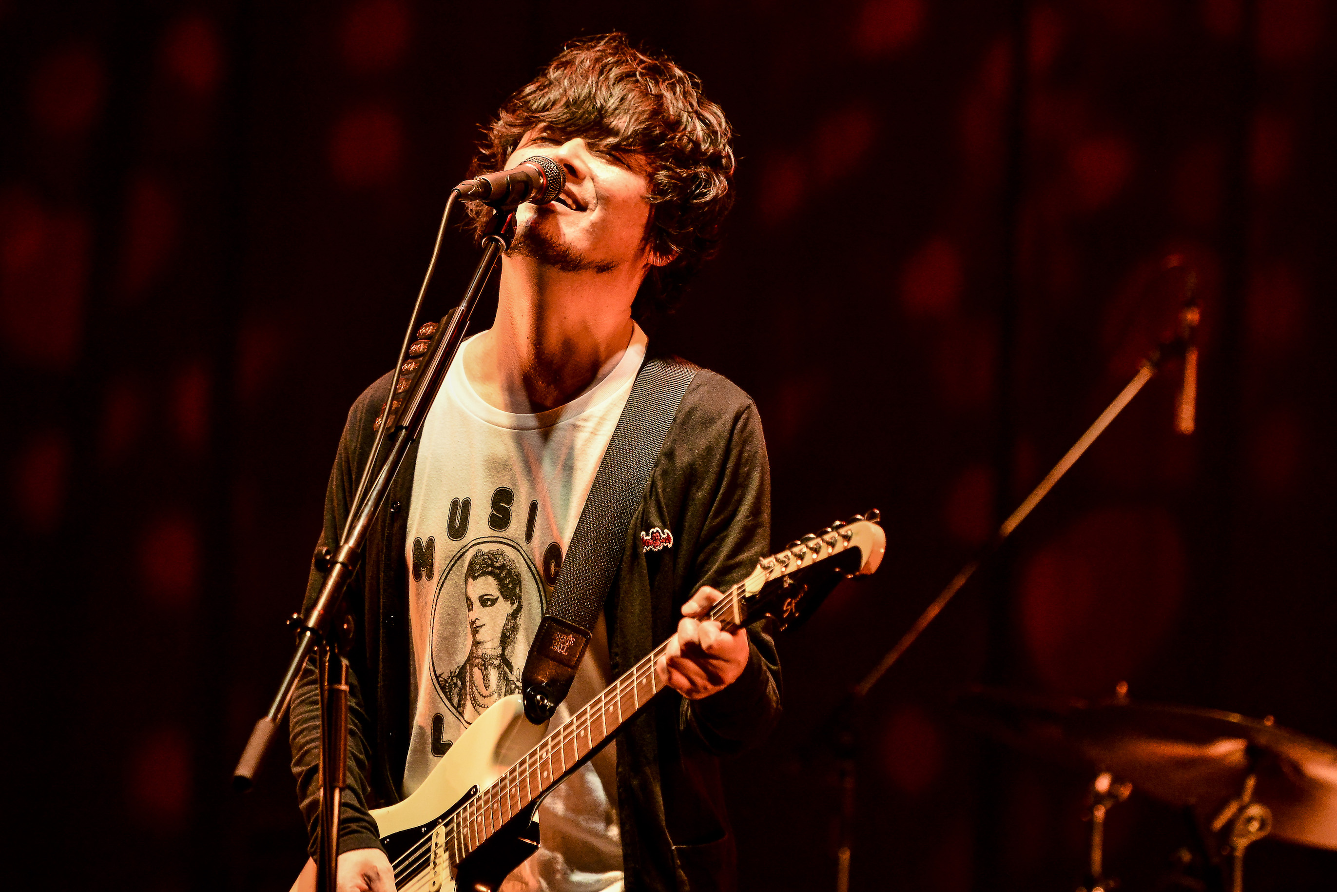 客電が落ち、前方の大型LEDモニターに少年の写真が現れる。「律儀な赤ん坊だったの……」。女性の肉声が重なる。面影からthe pillowsメンバーであることがわかり笑いが溢れた。そう、佐藤シンイチロウ(ds)、真鍋吉明(g)、山中さわお(vo,g)の順で、幼い頃からバンドを始め、デビューし、30周年を迎える変遷が母親の視線から語られる演出。異口同音で一様に「ファンに恵まれてのこと」と30年続いた理由が語られ、のっけからBUSTERSの涙腺が決壊する。“聴こえてくるのは~キミの声~”、アカペラで山中のボーカルが鳴り響き、「この世の果てまで」で祝宴の幕は上がった。