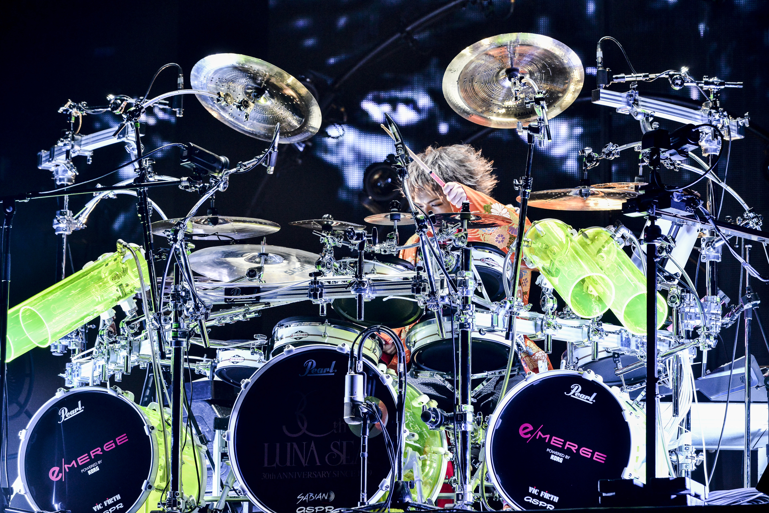 中盤の真矢(Dr)によるドラムソロでは、5月の結成記念日に開催された日本武道館公演に引き続き、能の囃子方とのコラボレーションに息を呑んだ。この日お披露目となったPearl新電子ドラムe/MERGE(イーマージ)をライヴ会場で鳴らしたのは、真矢が世界初となる。鼓や笛の音と呼吸を合わせ、内蔵された和太鼓の音色を打ち鳴らし、日本古来の伝統と最新テクノロジーとの融合でオーディエンスを魅了した。本公演は2017年に続き、全メンバーの楽器に水素燃料電池による電力を使用。環境に配慮するだけでなく、一音一音を際立たせるクリアなサウンドを実現した。この世界初の試みはLUNA SEAを起点に、去る11月に行われたU2来日公演にも波及している。更に今回、SUGIZOは自前の燃料電池車(及び周辺機器)による電力を提供。出演者が自力で電力をまかなうライヴもまた、世界初である。バンドとしての音楽性を究めるだけでなく、音楽の技術革新や社会貢献の旗手となることによっても、レジェンドの名にふさわしい姿を示していた。