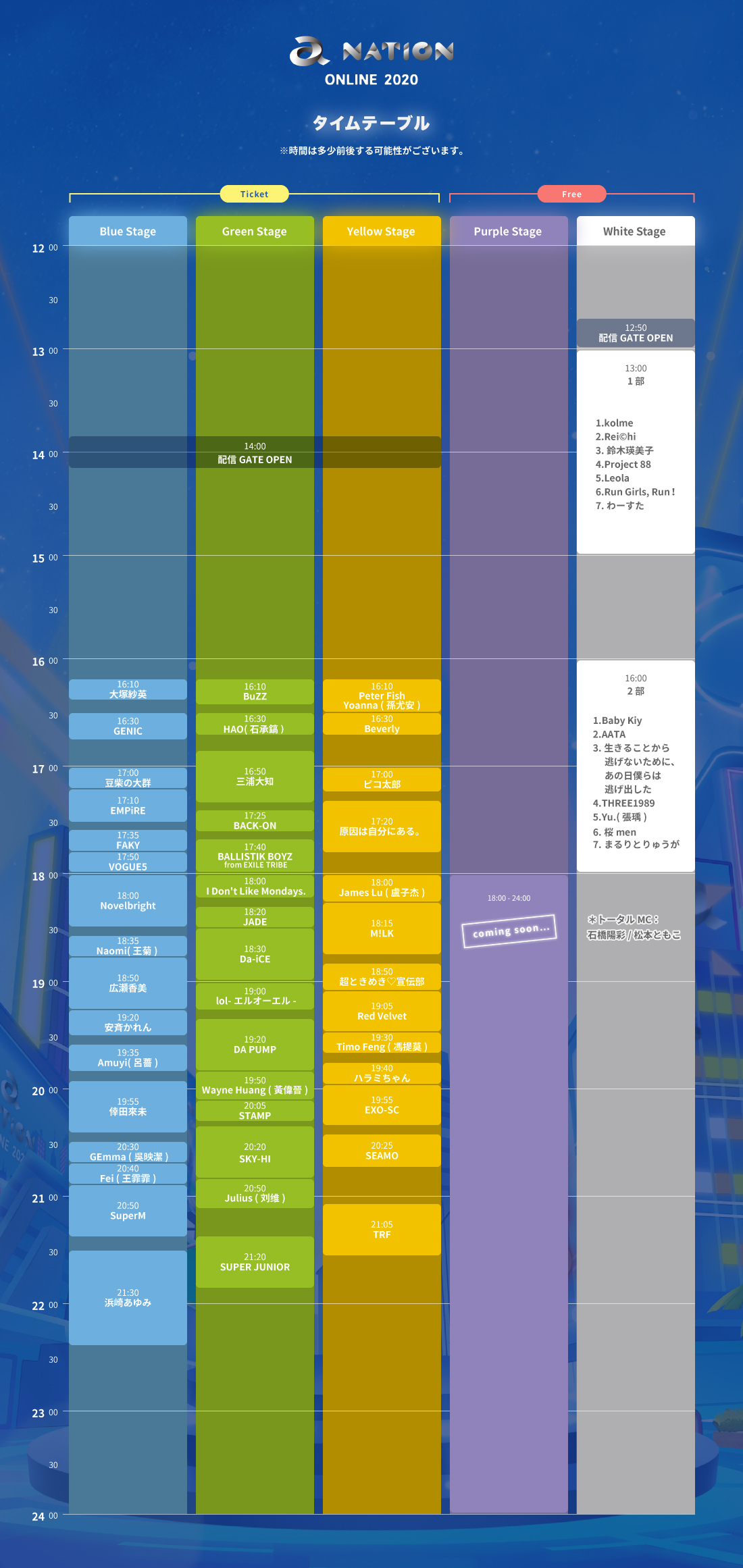 Blue Stageは浜崎あゆみが通算17回目のヘッドライナーを務め、Green Stageは2度目のヘッドライナーとなるSUPER JUNIOR、 Yellow Stageは19年連続皆勤賞のTRFがヘッドライナーを務める。