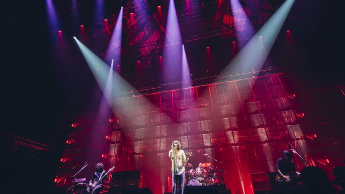 ロック少年のイノセンスを凝縮したような「空の青と本当の気持ち」までエマ楽曲のコーナーが続いたところで、暗転。ビジョンの映像では時間がどんどん巻き戻され、2016年の代々木公演、さらには再始動の象徴である金色のサナギと「準備ALRIGHT?」のメッセージが映し出される。舞台に再登場したメンバーが力強く響かせたのはもちろん、再始動の象徴的ロックナンバー「ALRIGHT」。刻一刻とギアを上げていく吉井の歌声とバンドの熱演は、「SPARK」でさらなる高揚感を体現していく。