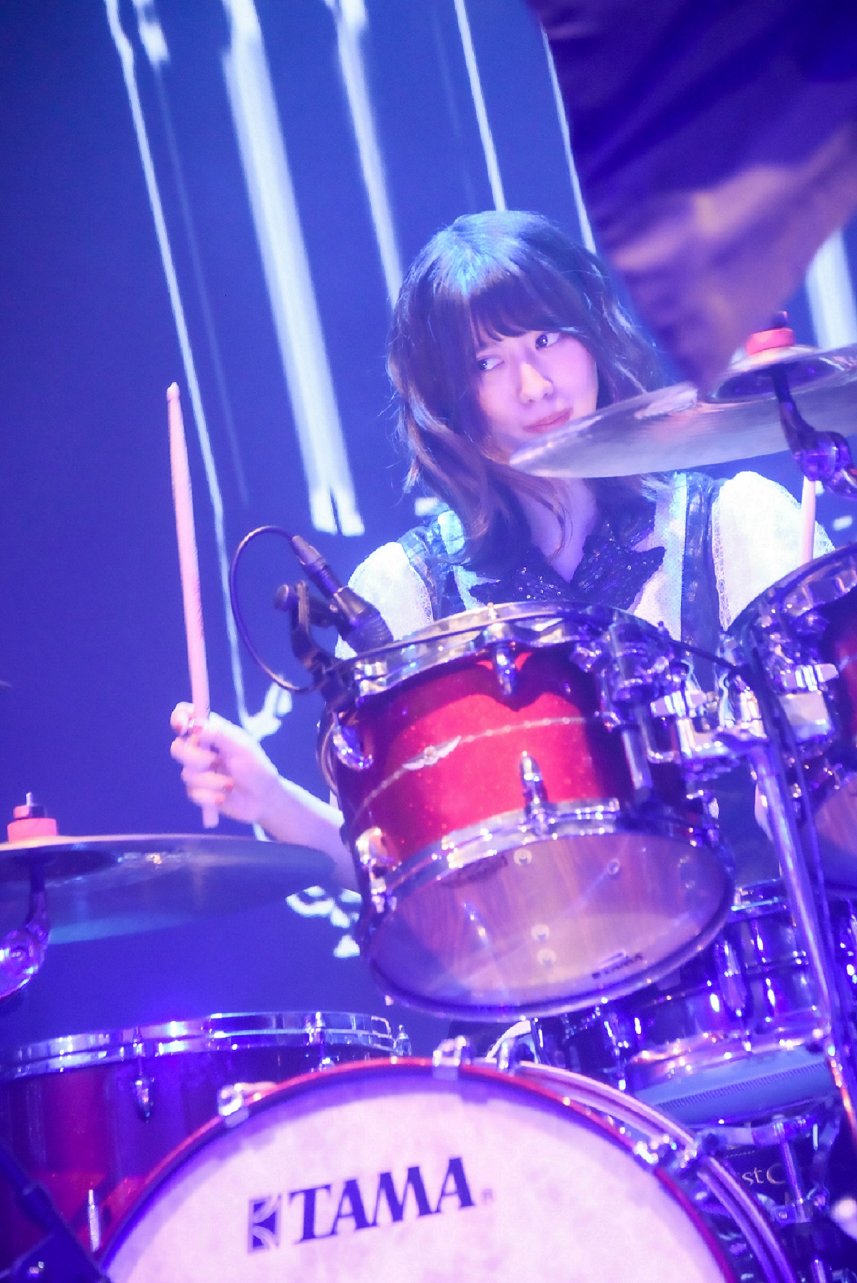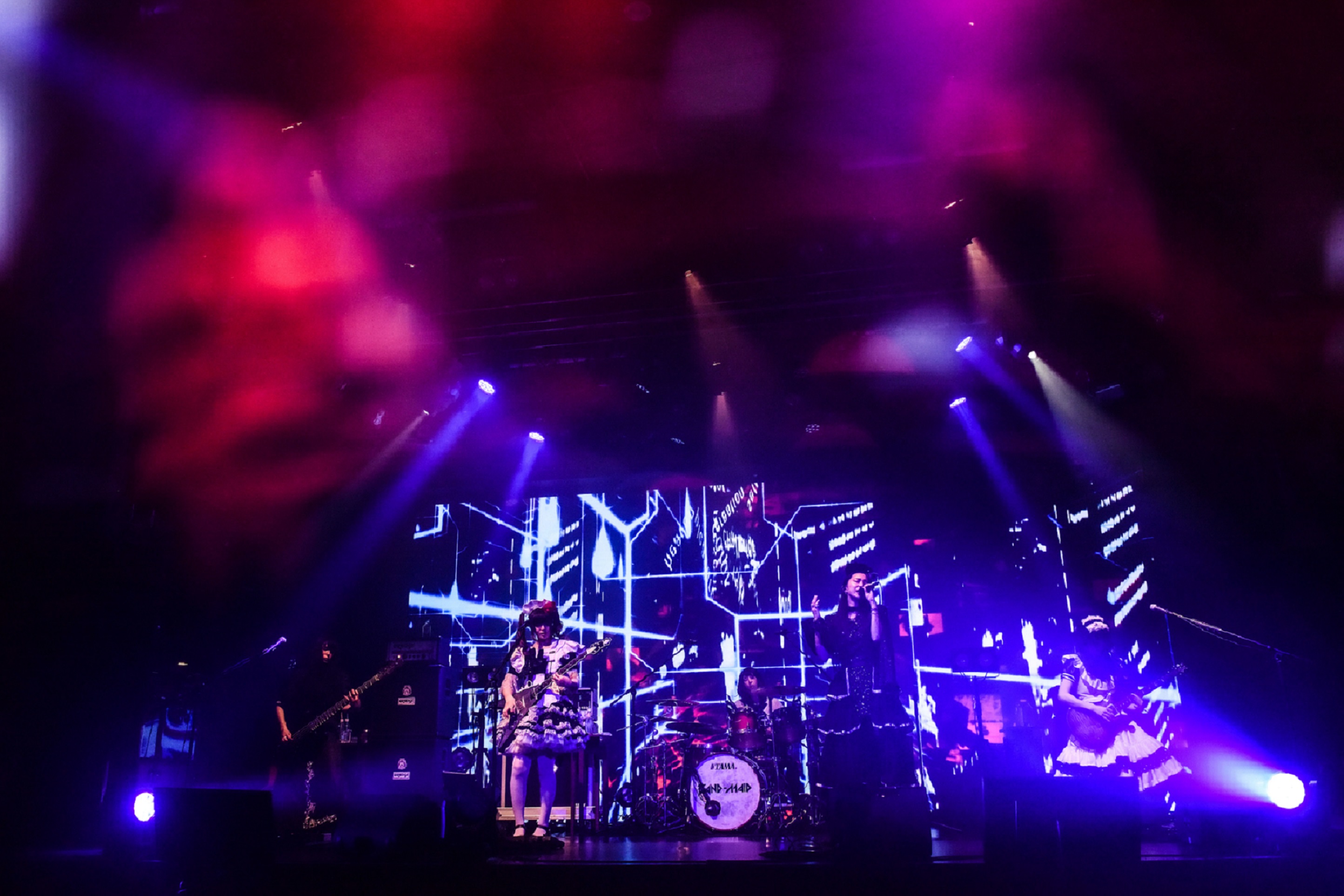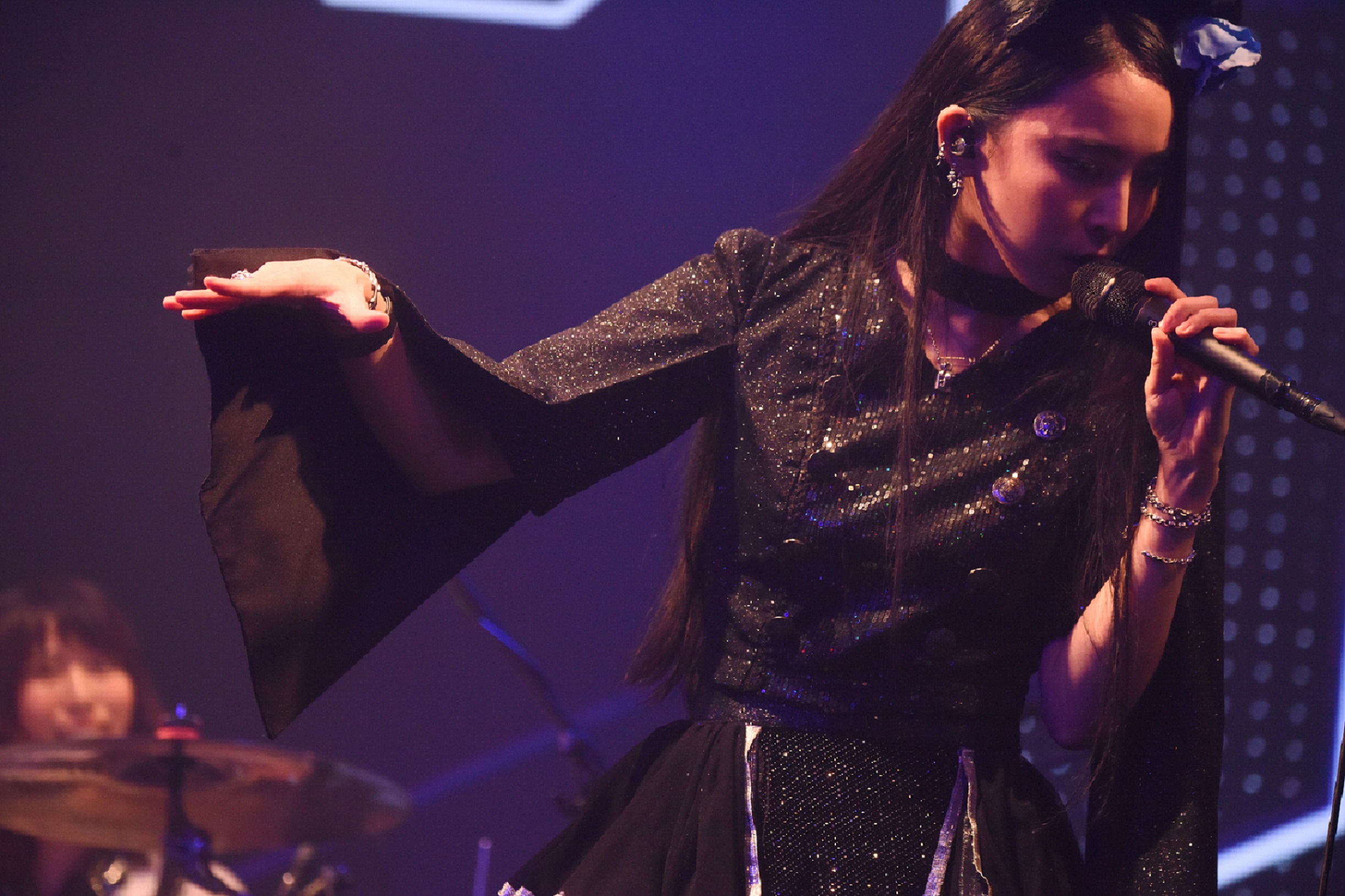 続くインスト楽曲「Don’t be long」では、縦横無尽なMISA(Ba.)のベース、AKANE(Dr.)のタイトなドラムに、KANAMIのメロディアスなソロ・ギターで骨太な演奏を見せつける。圧巻の演奏後は、お給仕恒例、小鳩ミクによる“おまじないタイム”で画面の前のオーディエンスとコール&レスポンスを繰り広げたり、海外のオーディエンスへ向け英語で呼びかけたりと、ファンとの交流もかかさない。激しい演奏と親しみやすいキャラクターのギャップもまた、ファンの心を掴んで離さないのだろう。