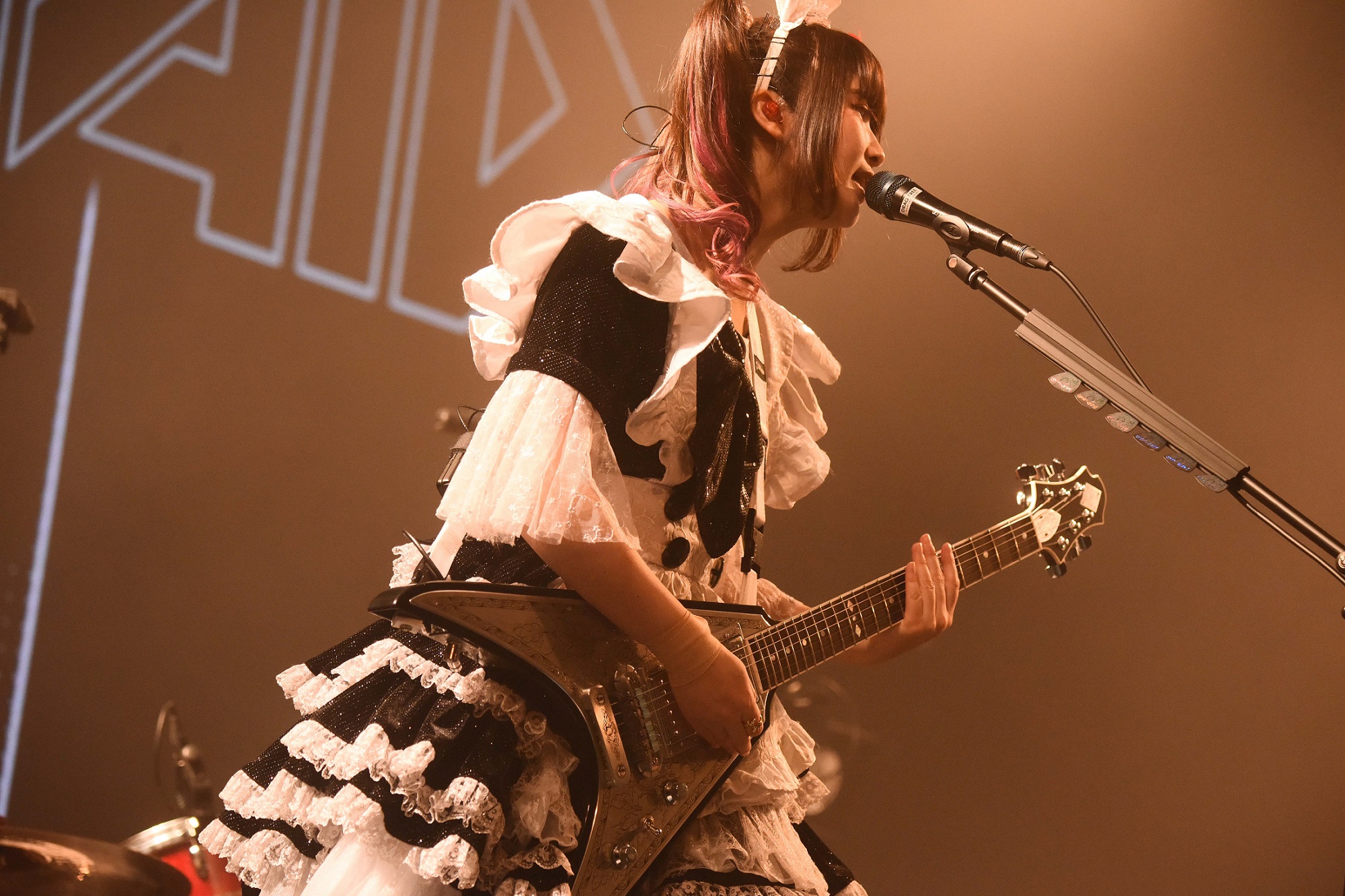 「Daydreaming」ではSAIKIが力強くしっとりと歌い始めると、小鳩ミク(Gt.&Vo.)の歌も優しく絡み、ツインボーカルで伸びやかに歌い上げる。SAIKIと小鳩ミクが互いの個性と歌声を引き立て合う、ボーカルの幅広さもBAND-MAIDの魅力のひとつだ。