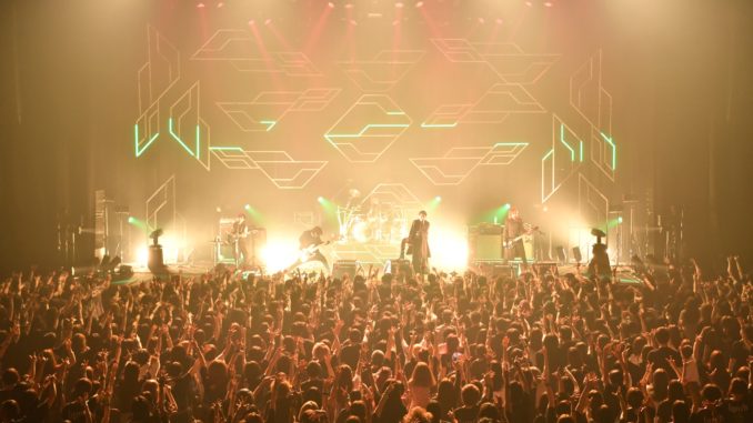 序盤はアッパーな楽曲たちが息継ぐ暇もなく押し寄せ、暴力的なまでのVo.葉月のシャウトが会場をヒートアップさせていく。ステージにちりばめられた「ULTIMA」をイメージした近未来的なライトセットが5人とファンをつなぎ、輝かせる。