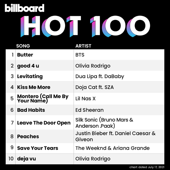 「Butter」はランクイン最初の週である6月5日付「HOT100」チャートで1位になり、最新チャートまで7週連続でトップを守り、ポピュラー音楽史にもう一つの道しるべを立てた。 これでBTSが「HOT100」で1位を獲得したのは通算12回目だ。 韓国歌手としては初めて「HOT100」で1位を記録した「Dynamite」(3回)を皮切りに、フィーチャリングに参加した「Savage Love」のリミックスバージョン(1回)、アルバム『BE』のタイトル曲「Life Goes On」(1回)、そして「Butter」(7回)に至るまで、BTSは1年足らずの華やかな歴史の1ページを飾った。